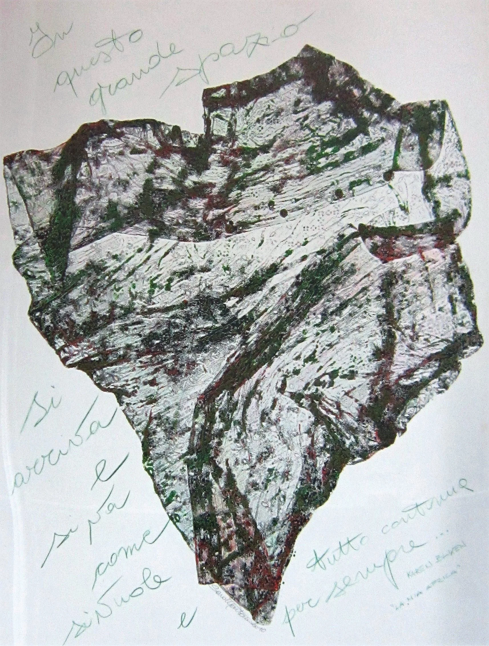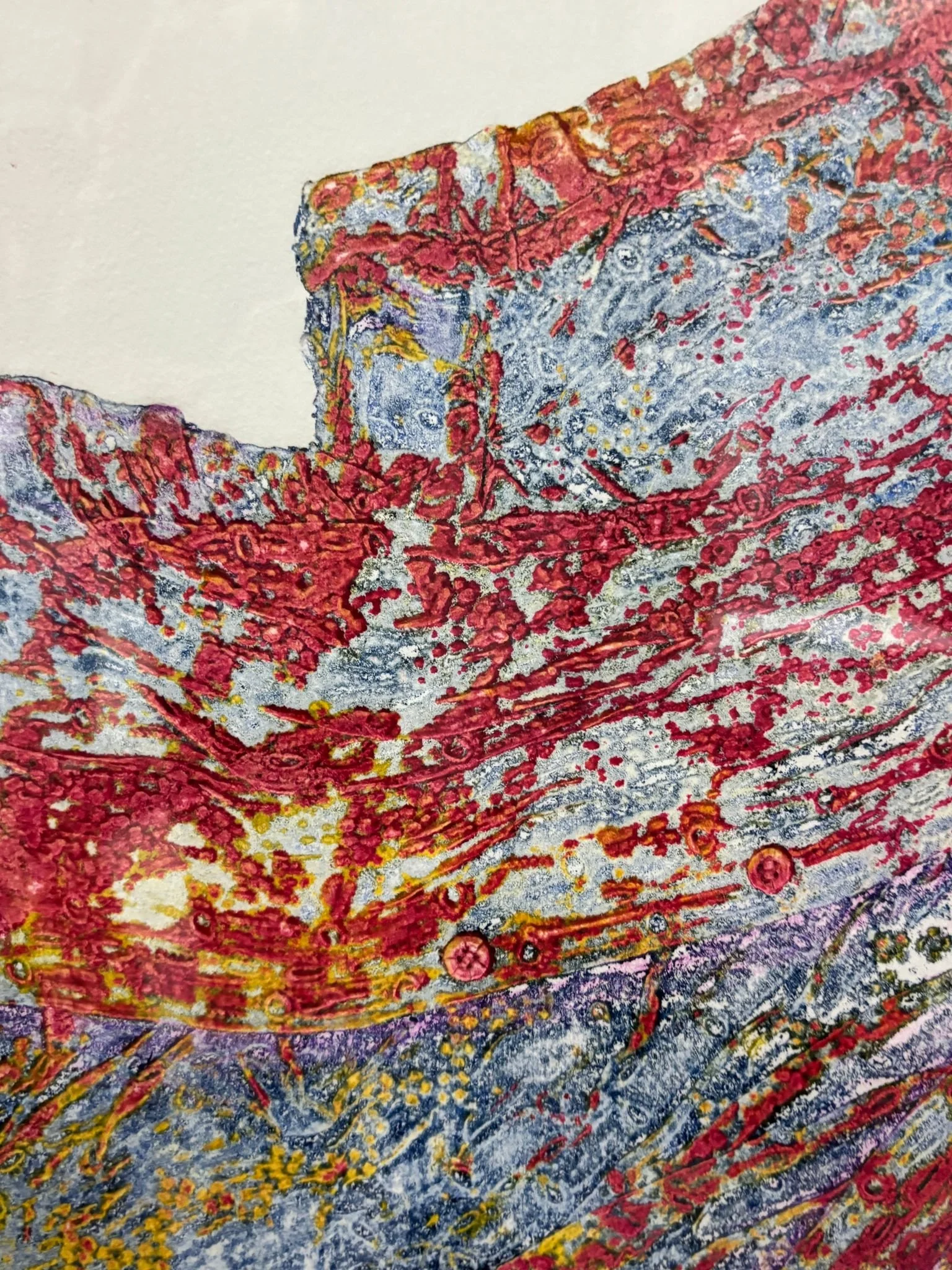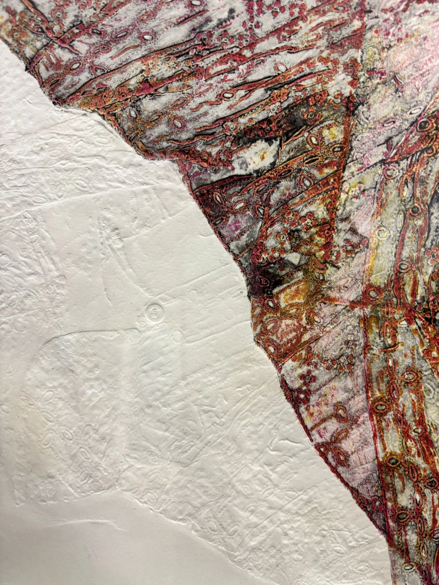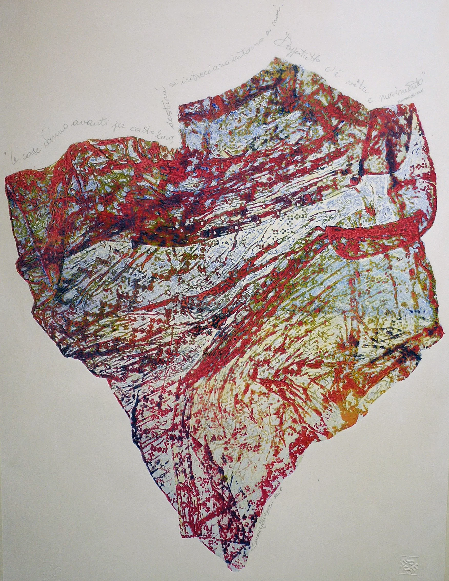 Nel monoprint, la stampa unica diventa terreno fertile per l’ibridazione: forme geometriche si intrecciano a tracce territoriali e archeologiche incise, mentre fioriture estroflesse in modeling paste emergono da matrici piegate in forma origata, evocando l’energia naturale della germinazione e ancora mappe a richiamare la storia ricca e secolare oltre a rappresentare la vita e i sentimenti stratificati nei secoli.